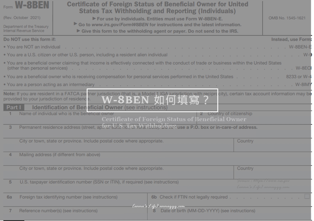 W系列表格在美國國稅局官網通通都有!Form W-8 BEN (Rev. October 2021) / Internal Revenue Service