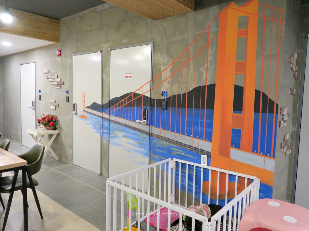 位於商辦大樓4樓,有電梯,1樓入口處前面幾個輕微的台階就靠自己了!每晚NT$500~1500,有單人房、雙人及三人床房型,步行至地鐵西面站約7分鐘左右,乾淨明亮輕工業風裝潢、附簡單早餐,有廚房可自行料理,價格甜美。