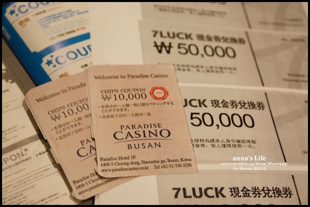 結束首爾的行程後,賭性堅強的大亨接著繼續轉戰釜山的Paradise Casino。憑釜山航空票根可贈送一萬、加入會員就送二萬元籌碼以及金海機場櫃檯可索取的購買四萬送一萬等優惠券。在大亨的精心佈局、以不用自費賭資的前提下,最後總共換得20多萬韓幣當作這次吃喝玩樂獎勵金!戰績算是相當輝煌,只是要用閒情逸致來換,以試試手氣的平常心看待就好、千萬別硬凹免得因小失大。