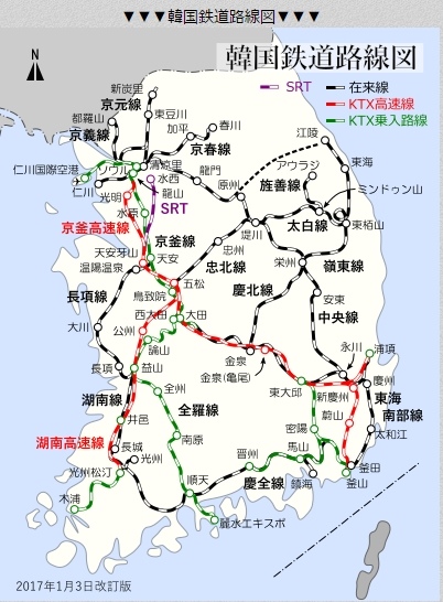 KTX以「京釜線」與「湖南線」為主軸,其他還有連接「麗水」或「昌原」等其他地區的「全羅線」與「京田線」。另外還有連接各地的京義線、京春線、中央線以及東海電鐵線。