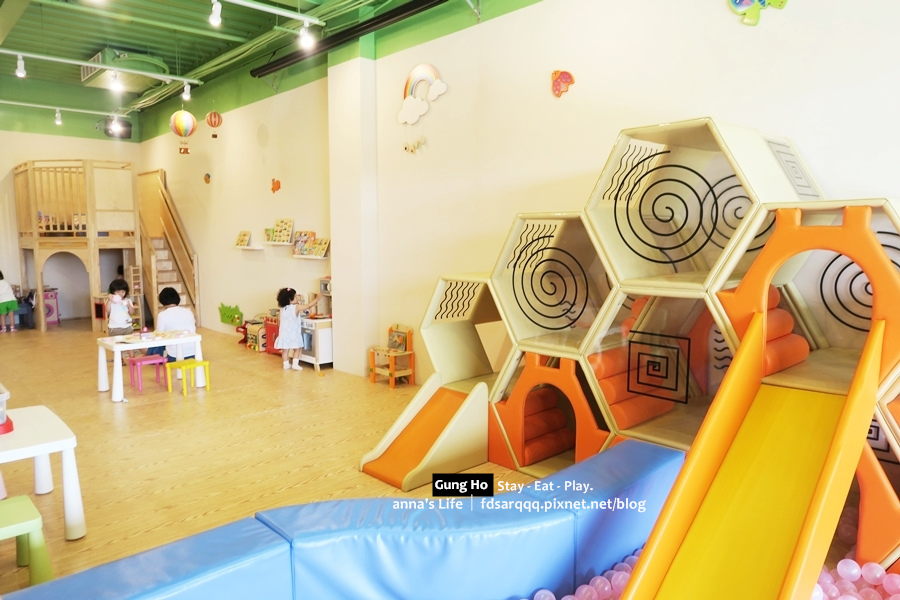 雖然這裡的遊戲空間相較於其他親子餐廳來說精簡很多,但該有的都有像是:蜂巢溜滑梯、粉紅球池、原木玩具、積木、賽車組、廚具組、益智遊戲…。