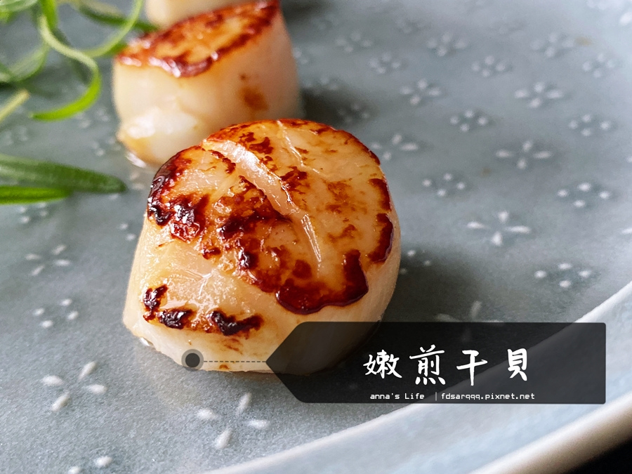 下鍋煎後,單面約90~120秒左右等上色翻面,盡量不要移動,不然怕翻來覆去導致時間太長過焦或一直翻攪變成炒干貝了…訣竅是各翻一次就好!