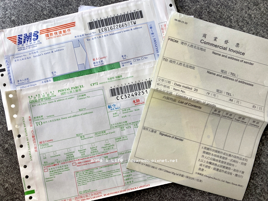 最後拖到不能再拖,默默抱著包裹到了郵局,櫃檯人員給了我上面這兩張:商業發票、國際包裹發遞單(報關單),用英文正確填好交給對方、付錢結束,就這樣…。之前還糾結了大半個月…(´・_・`)