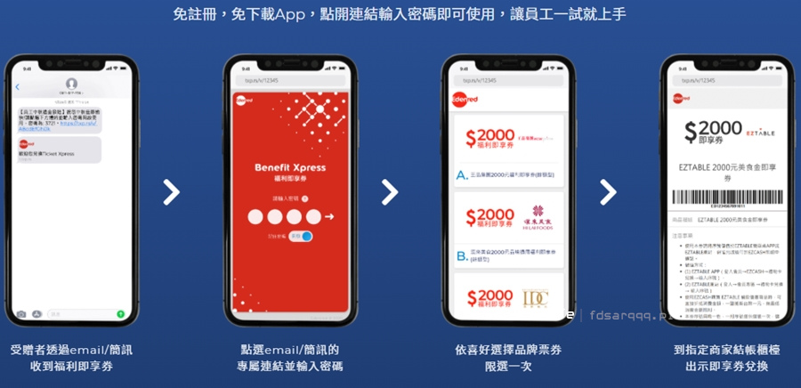 使用方式:不用另外下載APP、免註冊,點選受贈的專屬連結並輸入密碼,再依喜好選擇票券,到指定商家結帳時出示即可兌換結帳,可分次使用。