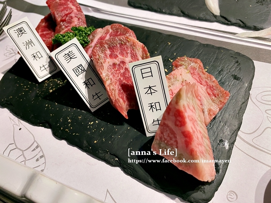 我的三國和牛$1290,選這款是因為份量少。建議吃法是美國→澳洲→日本,以倒吃甘蔗的方式感受不同產地的肉質差異。不過我是以正吃甘蔗的方式先從最優的吃起,最後一塊美和吃不下給了還在發育中的孩子。