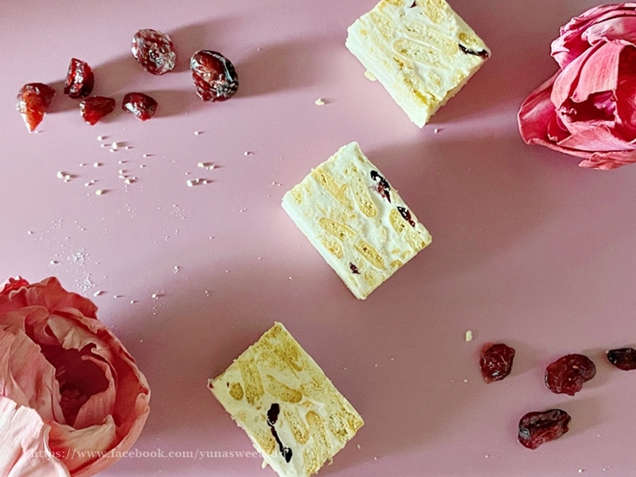 這款不加棉花糖的蔓越梅雪Q餅不是用速成的棉花糖簡單速成的,而是以蛋白用攪拌器打到發泡後再後製確實費工許多,重點是還融入了一點點獨家配方,有隱藏的彩蛋喔我猜對了、有興趣的朋友可以試試看!!